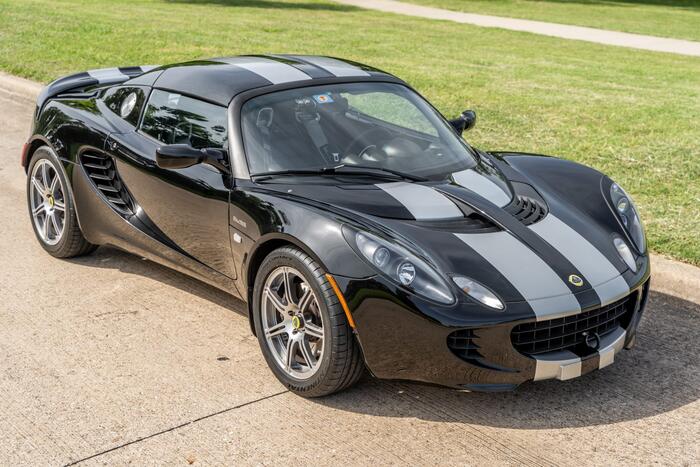 This 2008 Lotus Elise SC is one of 39 examples produced in the 60th AnniversaryEdition, and it is finished in Phantom Black with Arctic Silver racing stripes.Power is from a supercharged 1.8-liter inline-four paired with a six-speedmanual transaxle and a limited-slip differential. Equipment includes the Sport,Touring, and Track Packages as well as 16" and 17" split seven-spoke alloywheels, traction control, a removable soft top, a color-matching roof panel, aPioneer stereo, air conditioning, Ino Kinetics pedals, Schroth racing harnesses,and an aftermarket exhaust system.